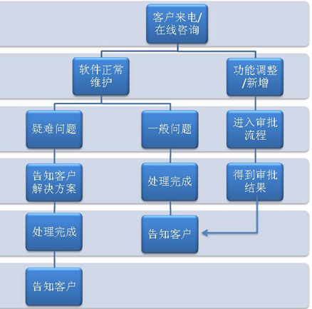 如客户提出的是需求类问题,应在2小时内告知客户,说明公司需求类问题处理方法,提交需求审核流程,在48小时内答复客户具体处理结果。如通过审批确定纳入产品计划,客服去电告知客户,需求已经纳入产品计划,并说明大致的产品升级时间。如未审批通过,将告知客户具体原因,如客户需求强烈,将客户转交具体销售代表,由销售代表与客户商谈单独开发合同。