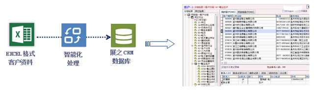 可以将绝大部分以EXCEL格式保存的客户资料导入到本系统,智能化匹配EXCEL中列和本系统列的映射关系,除导入客户公司和联系人的基本资料外,还可以导入历史联系记录。重复客户资料会自动合并或事后批量排重合并。