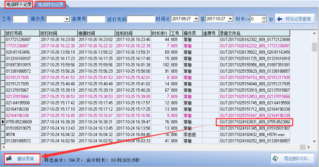 统计某时间段各工号呼入和呼出电话数量、时长等并,结果可导出EXCEL,双击可以打开通话记录明细。