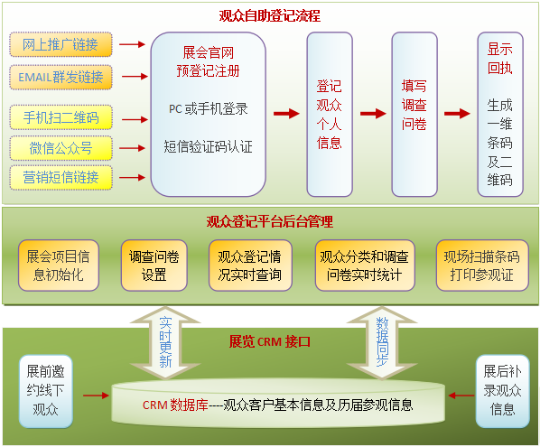 平台总体流程结构:展之观众登记平台主要由登记前台、管理后台、CRM接口等三部分组成,结构如下: