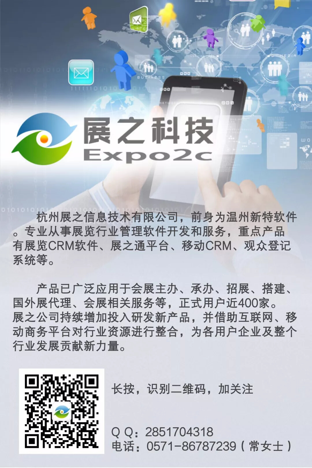 同时,展之云信息平台还能让您随时随地输入客户信息、调阅客户信息、掌握客户的动态。如果您还想了解更多关于展之云移动 CRM 的功能,欢迎扫描下方二维码,或拨打咨询电话,将给您更多惊喜哦!